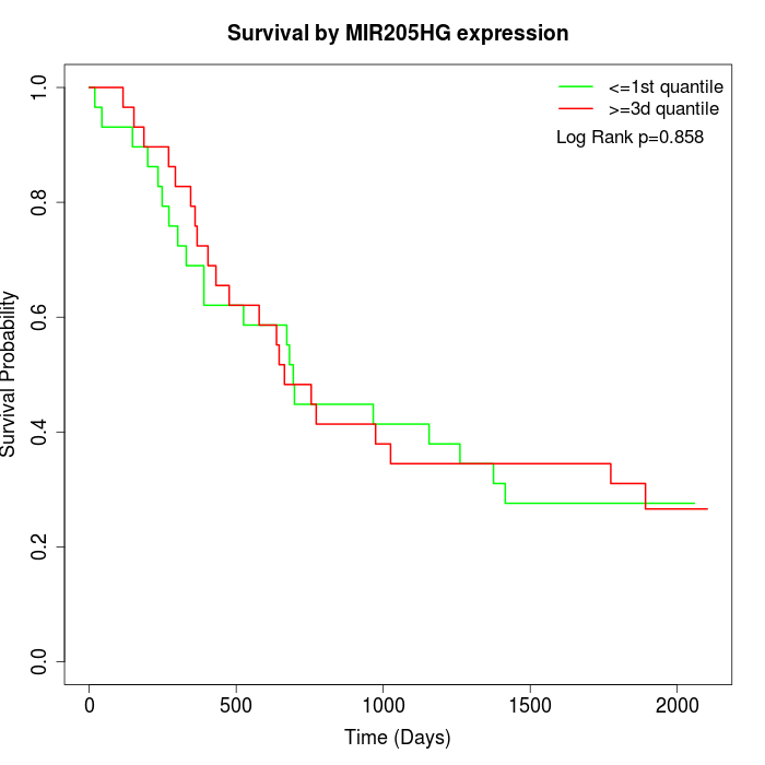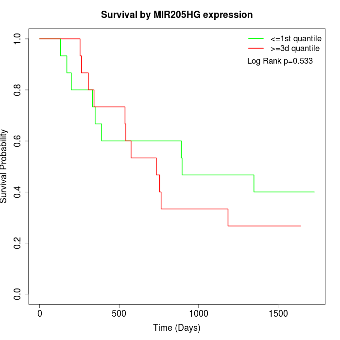Survival by MIR205HG expression: